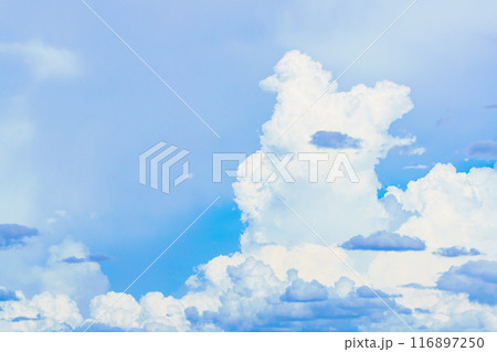 青空と飛行機雲と入道雲の水彩のイラスト背景