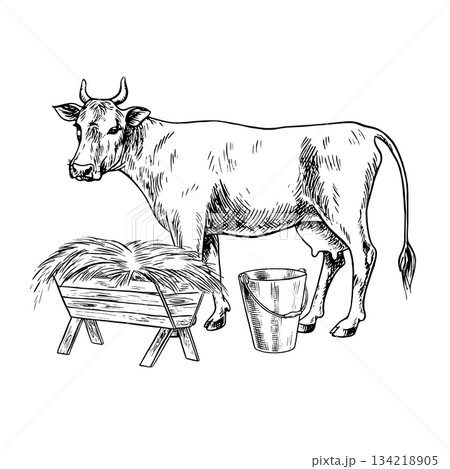 Cow milking. Black and white vector illustration drawn by hand. A cow standing in profile and eating hay. Perfect for dairy farms or agricultural projects, for labels, packaging, banners, and more.
