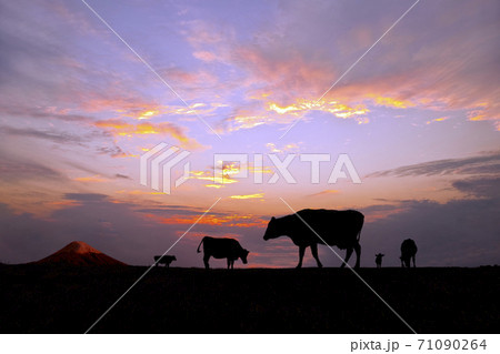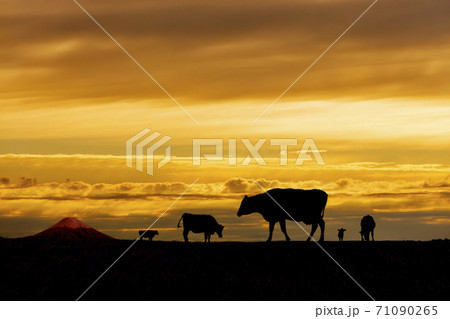 富士山と夕陽を背景に高原の牧場で草を食む複数の牛のシルエット
