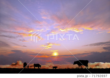 オレンジに染まる空を背景に高原の牧場で草を食む複数の牛のシルエット