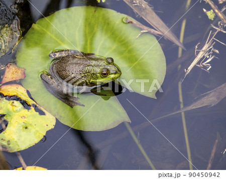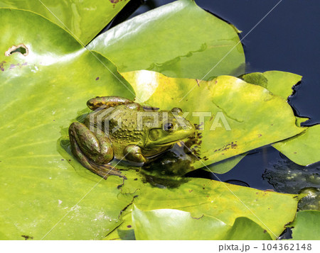 池に生えてるスイレンの葉に乗ってるウシガエル