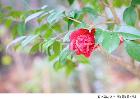 赤い花に白斑が入った可憐なヤブツバキの花。