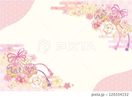 水彩で描いた鞠と紐と花模様の和柄の背景