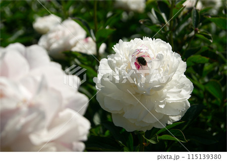 大きな見ごたえのある白い花シャクヤクとカナブン