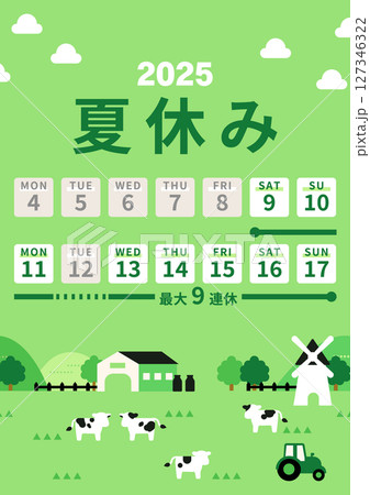 2025年夏休みスケジュール(最大9連休・牧場・緑の背景)