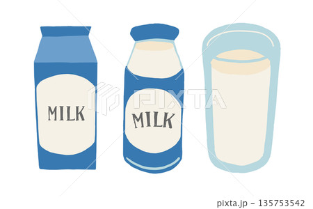 牛乳パック、牛乳瓶、コップに入った牛乳のイラストセット