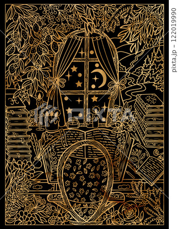 Black and gold illustration with mystic garden, plants and flowers, vintage chair and table with books and candles, magic window with fantasy landscape.