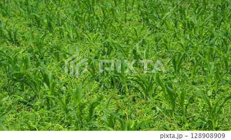 A beautiful and vibrant green crop field thriving under the bright and warm sunlight