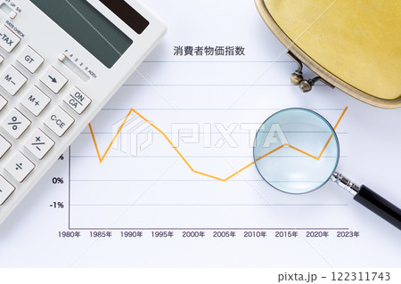 消費者物価指数グラフの年代推移とルーペと電卓とがま口財布