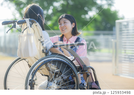 小学生が乗った車椅子を押す介護士
