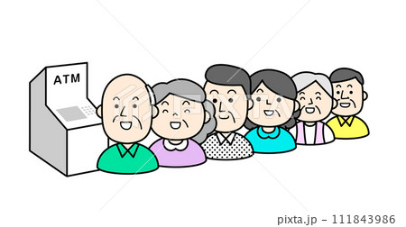 シンプルな人物イラスト 年金支給日にATMに並ぶシニア