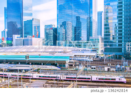日本の東京都市景観インバウンド続く…新幹線がズラリ…ホームには多くの外国人観光客が行き交う