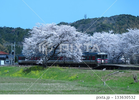 春の竹野駅(JR西日本の山陰本線)、ホームを出ていく「特急はまかぜ」と、満開の桜の遠望