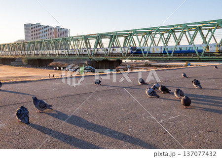 【総武本線】早朝の江戸川の鳩と総武線の電車