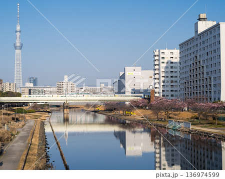 【河津桜】早朝の旧中川の早咲きの桜と新宿わかしお
