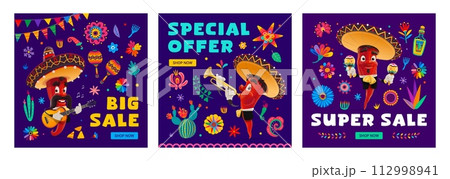 Cinco de mayo holiday sale banners, special offer and super big sale. Vector square promotional cards or social media posts with red hot jalapeno, chili, guindilla mariachi pepper musician characters