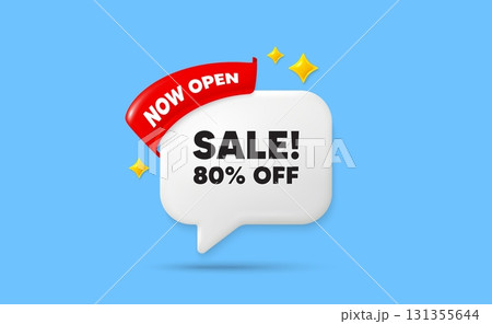 Sale ribbon speech bubble. Now open flag ribbon. Sale 80 percent off discount. Promotion price offer sign. Retail badge symbol. 3d sparkle stars speech bubble. Vector