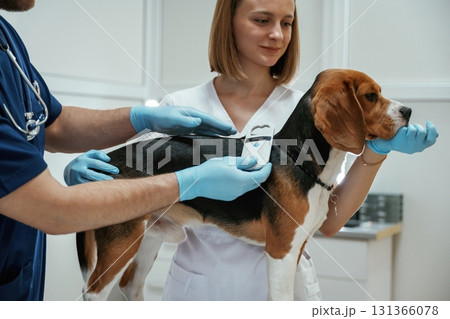 Searching for tag by using special equipment. Two veterinarians are working with beagle dog in clinic