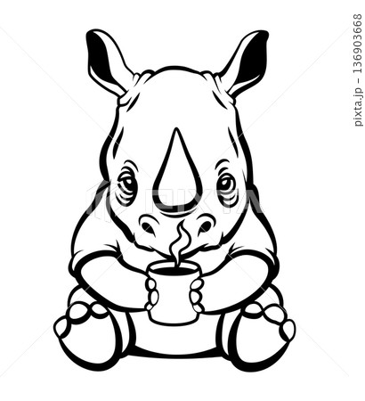 sleepy cute rhinoceros illustration, Chubby baby rhino sitting peacefully with beverage in hand, Whimsical baby rhinoceros sketch featuring cozy posture and delightful facial expression