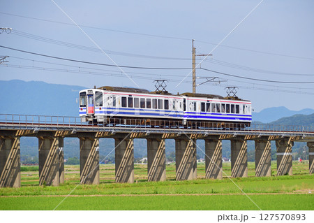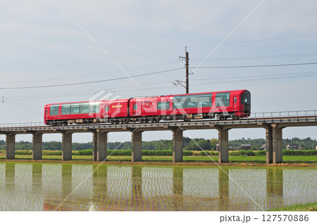 水田地帯の高架橋を走る北越急行 HK100形(単行)