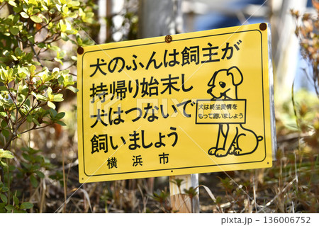 日本の横浜都市景観「犬のふんは飼主が持帰り始末し犬はつないで飼いましょう」「犬は終生愛情…=横浜市内