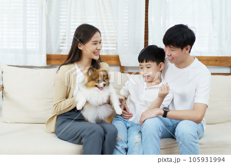Happy cheerful Asian family father mother and son enjoy playing with a lovely little dog in living room together. Asian little boy staying with parent in living room with a pet.