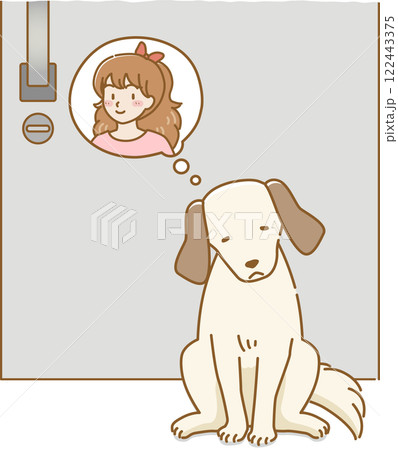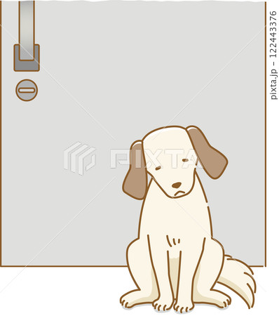 玄関のドアの前で主人を想う寂しそうな耳の垂れた犬