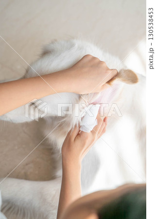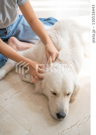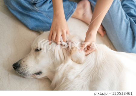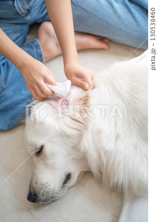 大型犬(ゴールデンレトリーバー)の耳掃除の様子(ペットケア・衛生管理)