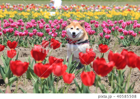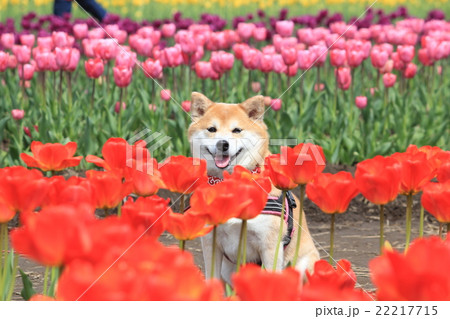 笑顔の柴犬とチューリップ(フライアウェイ)