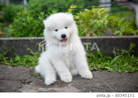 Fluffy white Samoyed puppies dogs are playing with a ball