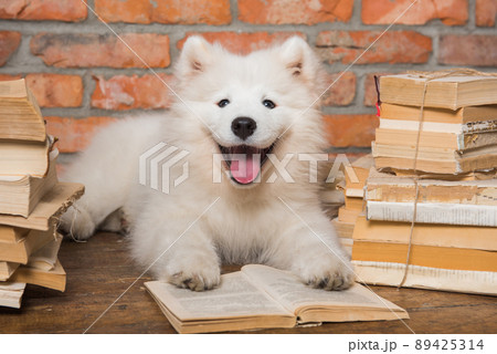 Two White fluffy Samoyed puppies dogs with book near the fireplace with candles