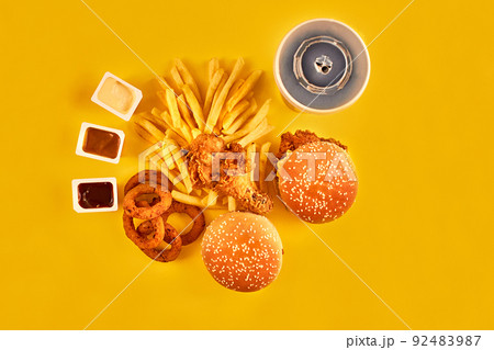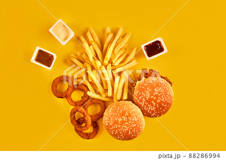 Fast food and unhealthy eating concept - close up of fast food snacks on yellow background