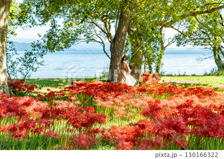 滋賀県高島市 琵琶湖畔へと続く園地に咲く秋の桂浜園地の彼岸花群生地でポーズをとる女性