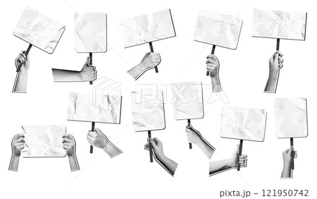 Mixed media hands holding placards. Crumpled paper blank protest or demonstration signs in halftone hand. Banners for activism, empty sign on stick for messages or announcements. isolated vector set