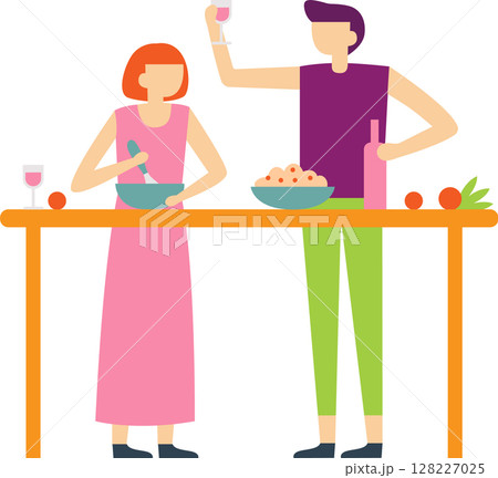 Young couple enjoying a moment together in a modern kitchen, mixing fresh ingredients in a bowl while sipping wine at a high table, creating a delightful meal and celebrating their love
