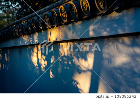 妙心寺・退蔵院の秋、水子地蔵へと続く白壁の築地塀に夕日が差す秋のイメージ、 秋の樹影