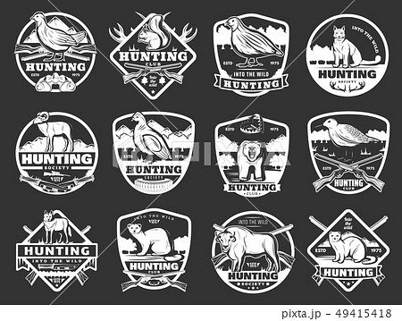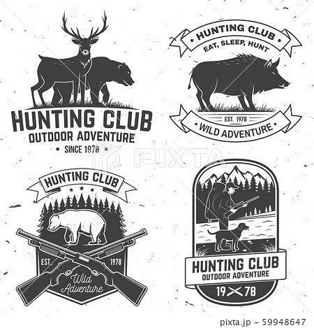 Set of Hunting club badge. Vector Concept for shirt, print, stamp. Vintage typography design with hunting gun, boar, hunter, bear, deer, mountains and forest. Outdoor adventure hunt club emblem