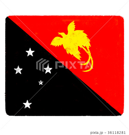 石板の上に描かれたパプアニューギニアの国旗と、掘ったような「Papua New Guinea」の文字
