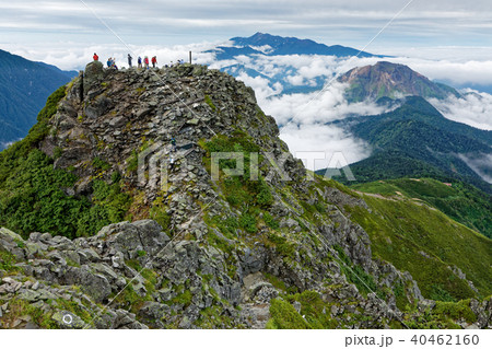 西穂独標の登山者と焼岳・乗鞍岳の眺め