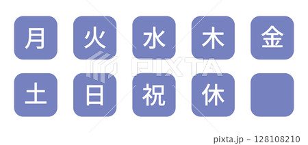 曜日のマークのイラスト セット 角丸四角に白抜き文字、背景透過、土日祝休カラー