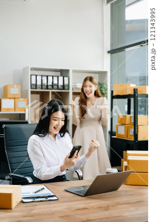 Starting small businesses SME owners, two check online orders Selling products working with boxs freelance work
