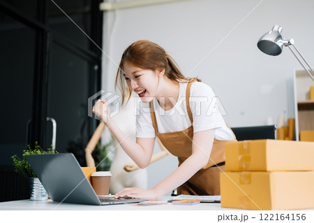 Young business owner woman prepare parcel box and standing check online orders for deliver