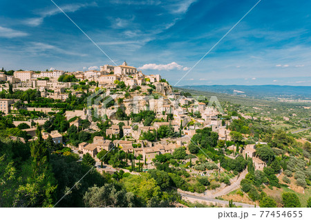 Gordes, Provence, France. Beautiful Scenic View Of Medieval Hilltop Village Of Gordes. Sunny Summer Sky. Famous Landmark.