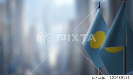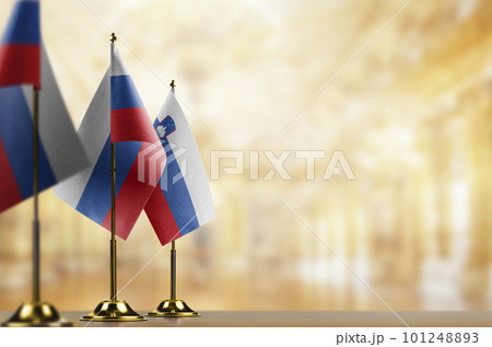 A garland of Bosnia and Herzegovina national flags on an abstract blurred background