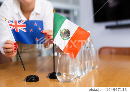 A woman in a white blouse with friendly smile arrangs flags of Mexico and New Zealand for meeting.