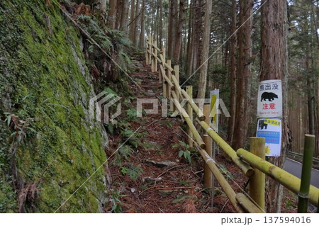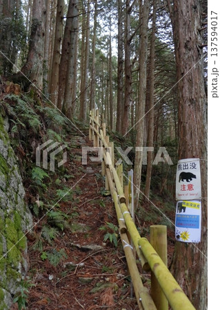 熊野古道 登山道に掲示される熊出没注意の張り紙(通り峠入口)