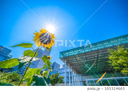 日本の川崎都市景観 夏。猛烈な暑さ、照りつける太陽光とひまわり。奥は川崎駅…=7月26日