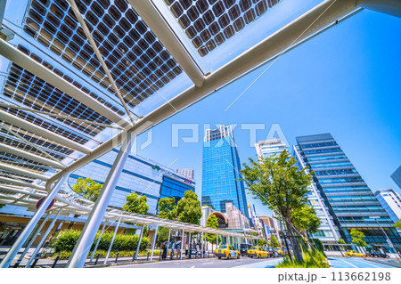 日本の川崎都市景観 希望の明日…川崎駅やタクシー乗り場のソーラーパネルなどを望む…輝く未来へ=26日
