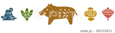 年賀状素材 イノシシと縁起物イラストセット 手書き カラフル