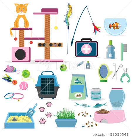 Set of accessories for cats. Pet shop equipment. Cartoon kitten stuff - toys, beds, litter tray